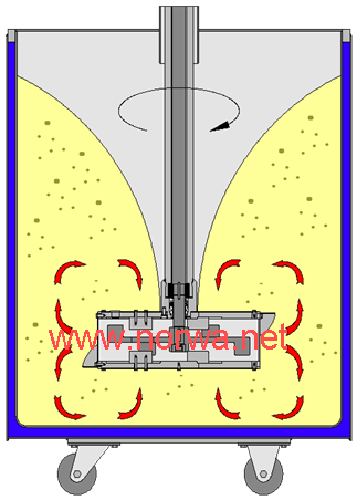 ●研磨過程中,籃子旋轉(zhuǎn)。由流體力學(xué)設(shè)計(jì)物料從上下部分吸入裝有研磨介質(zhì)的籃子內(nèi),研磨后的物料 在離心力作用下從周邊縫隙甩出