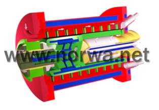 NORVA諾研高效納米砂磨機采用銷棒式結(jié)構(gòu)設(shè)計,物料隨著進(jìn)料泵由頂端進(jìn)入研磨腔,隨著轉(zhuǎn)子的旋轉(zhuǎn)而均勻分布,在轉(zhuǎn)子和定子縫隙內(nèi)渦流離心力的作用下對物料進(jìn)行了徹底的預(yù)分散處理。在接下來強烈的研磨中,轉(zhuǎn)子棒銷和定子對研磨介質(zhì)連續(xù)發(fā)生劇烈的撞擊變化,研磨介質(zhì)再作用于物料,物料得以研磨,研磨后的物料在研磨腔停留時間特別短,從而得到一個極窄的產(chǎn)品粒度分布帶,在進(jìn)料泵壓力和離心力作用下,由于密度的不同,研磨介質(zhì)返回研磨腔,物料卻沿著離心力相反的方向經(jīng)縫隙式分離器過濾分離,循環(huán)往復(fù)。 |